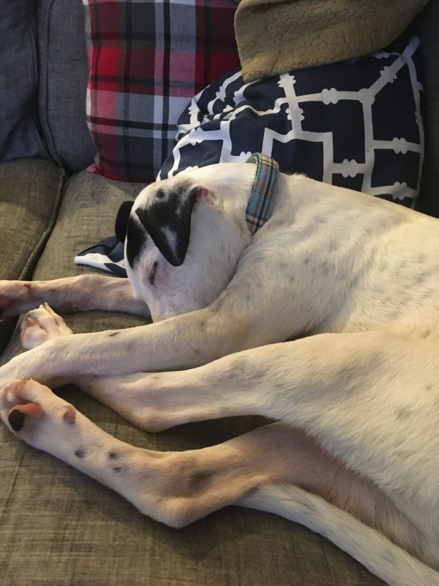 Sampson was overwhelmed with the takedown of Christmas decorations today. They’ve been up since he came home with us three weeks ago! Just a few more boxes to go, pup.