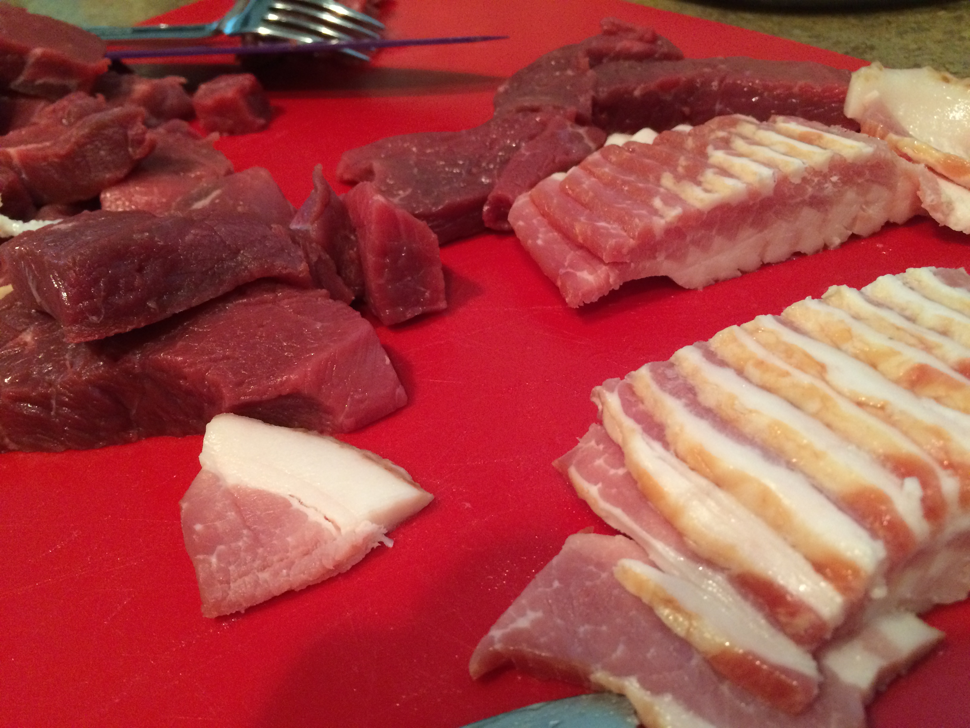 After dicing up the steak and making quick lardons with the frozen bacon, we got to work. We had read online that grinding the meat twice was a good habit, but we wanted a good texture to the burgers. We ended up with this beautiful combo –