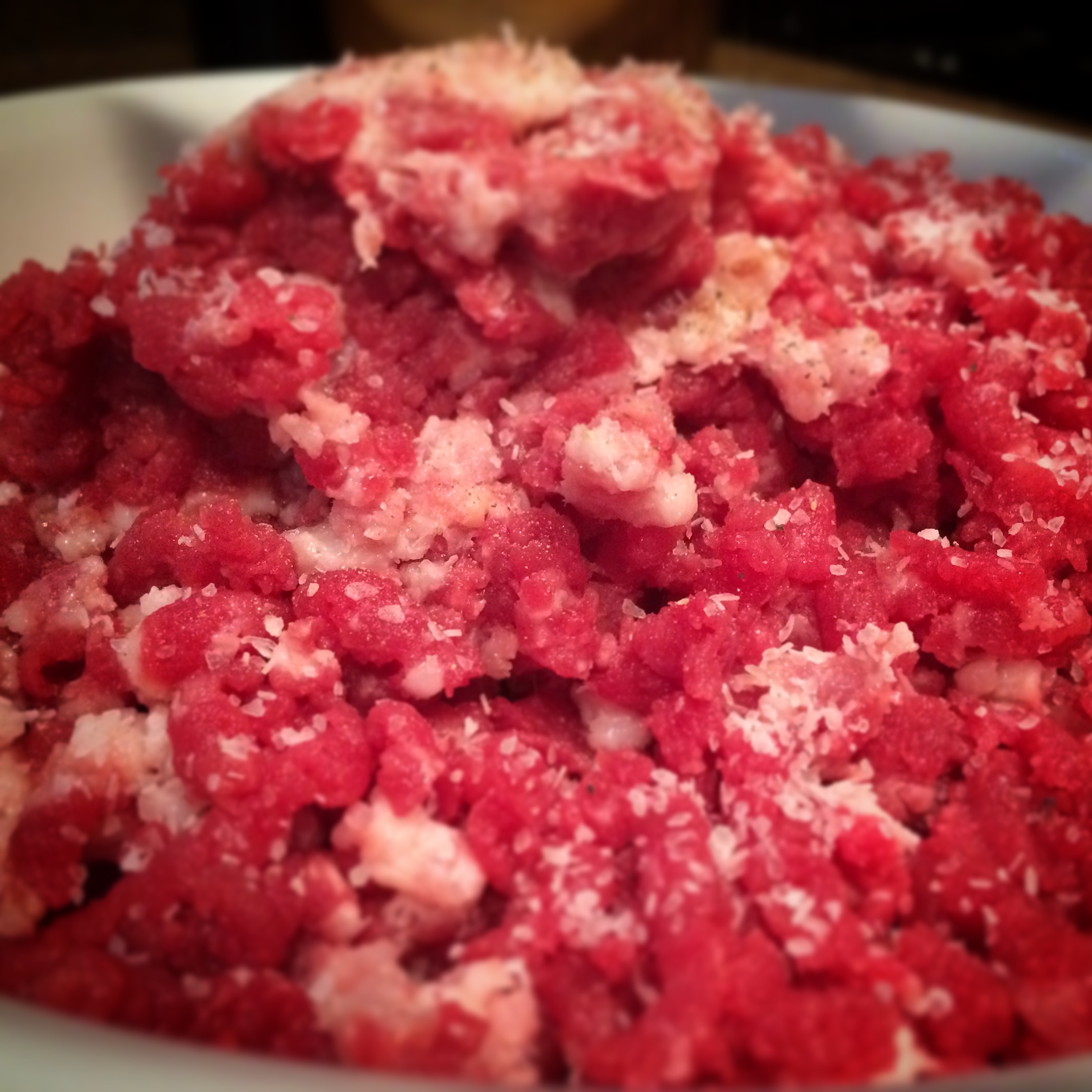 We actually used sirloin steak and frozen bacon to make our patties. The colder the meat, the better the grind (only took a few tries to learn this)