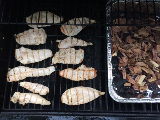 After cutting the chicken into strips, season it with salt and pepper (or Cajun seasoning for twice the bang!), then grill the chicken strips low and slow, around 4-5 minutes on each side, then more as needed to ensure proper preparation of the chicken. We used mesquite chips for a gas grill to give ours a great, smoky taste!
