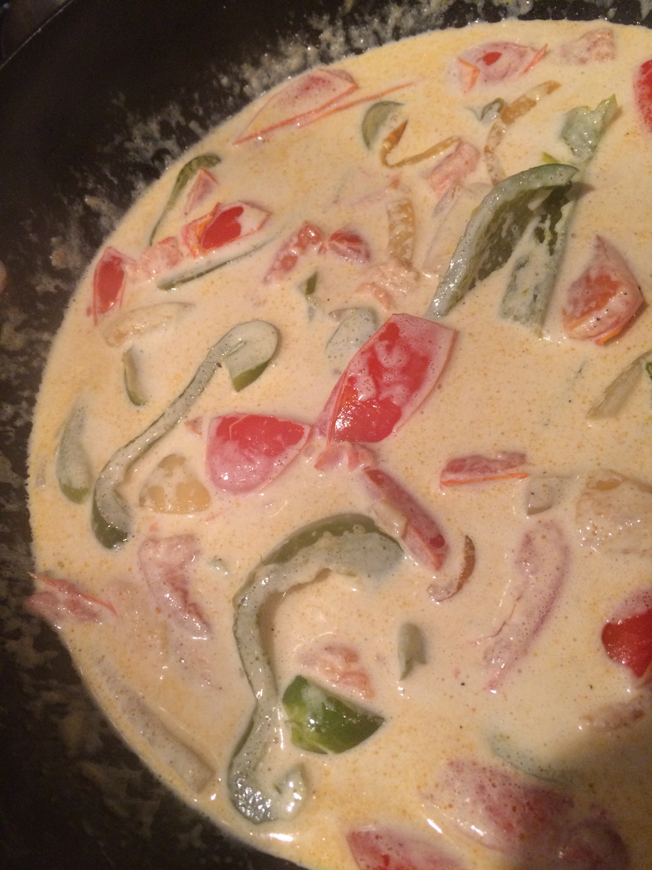 Once the pasta has cooked and has been drained, and the sauce is at a consistency similar to alfredo sauce, add the pasta in with the vegetables and sauce. Turn the burner off and toss all ingredients in the pan. You can add the chicken in as well, or place it on top of the pasta, veggies and cream sauce as you are about to serve the meal.