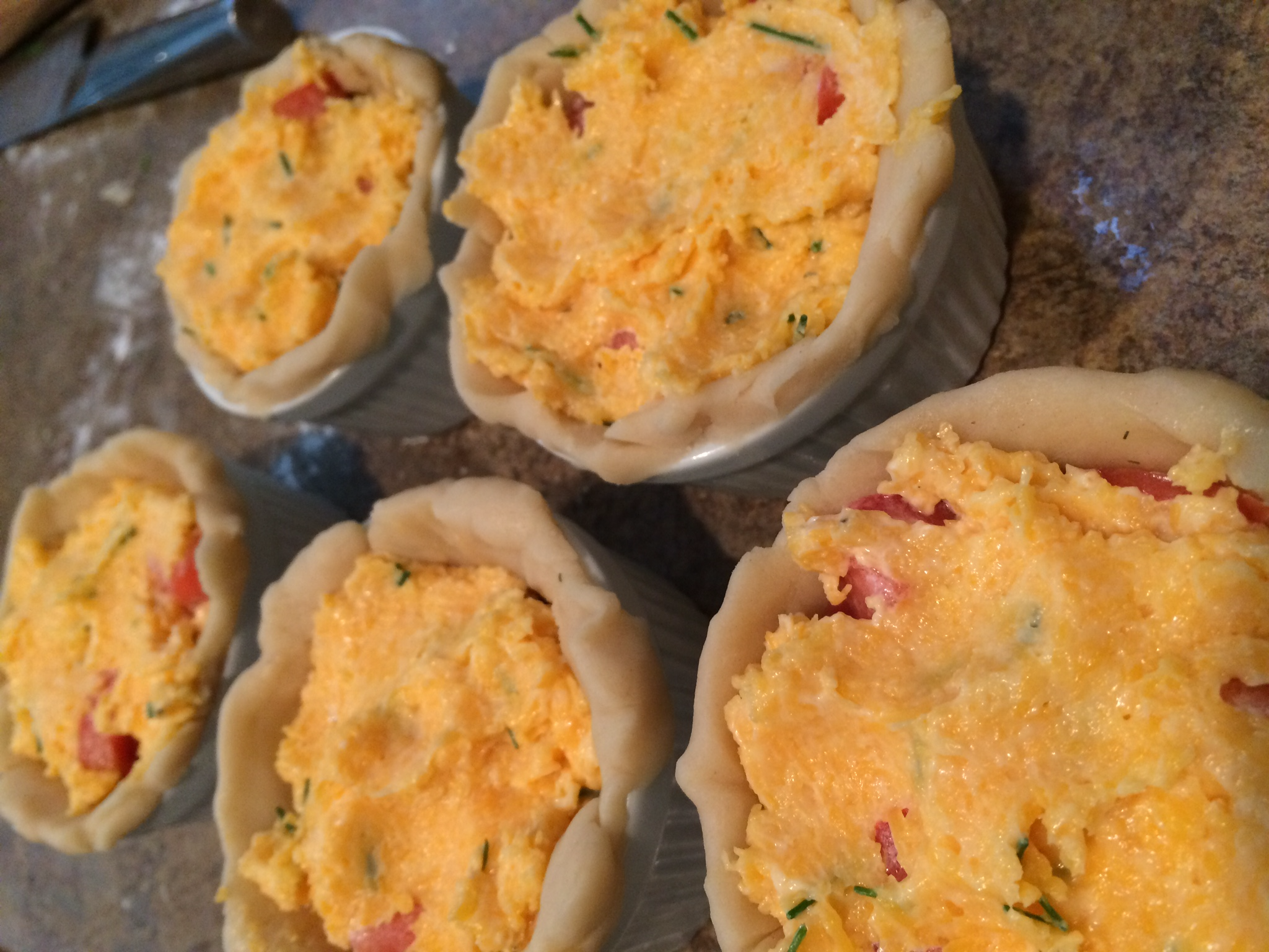 Place crust into each ramekin. Roughly trim excess dough about 1/4 above rim. Crimp crusts as desired (I prefer rustic-looking crusts; these are scratch-made, ya know!)