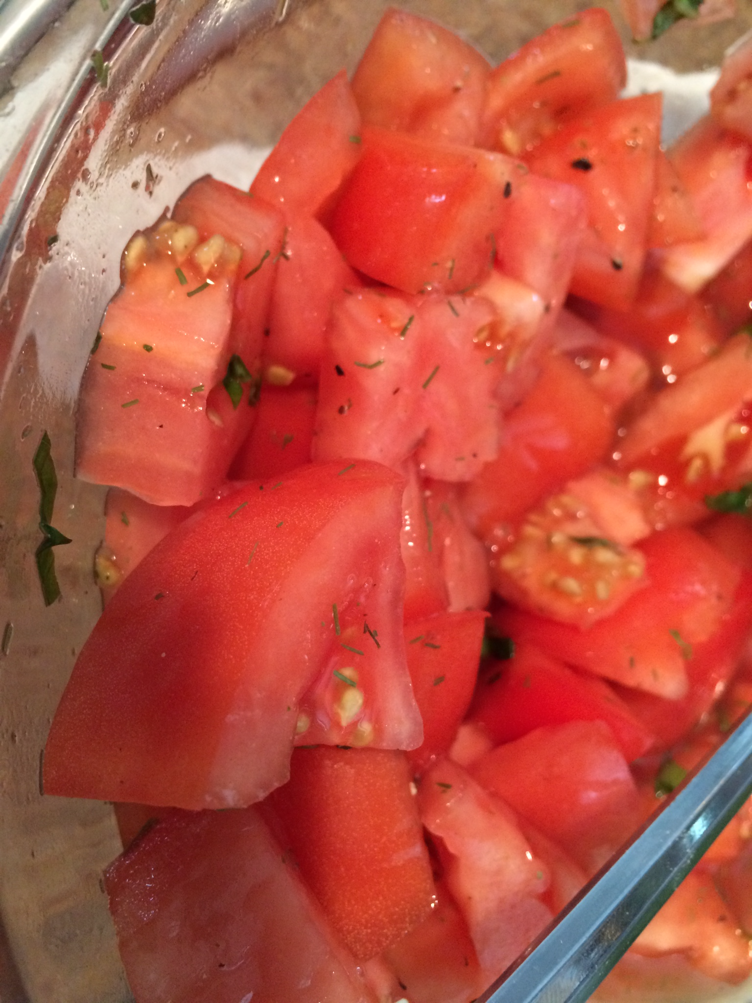 While dough chills, cut tomatoes into medium dices and add to large mixing bowl.