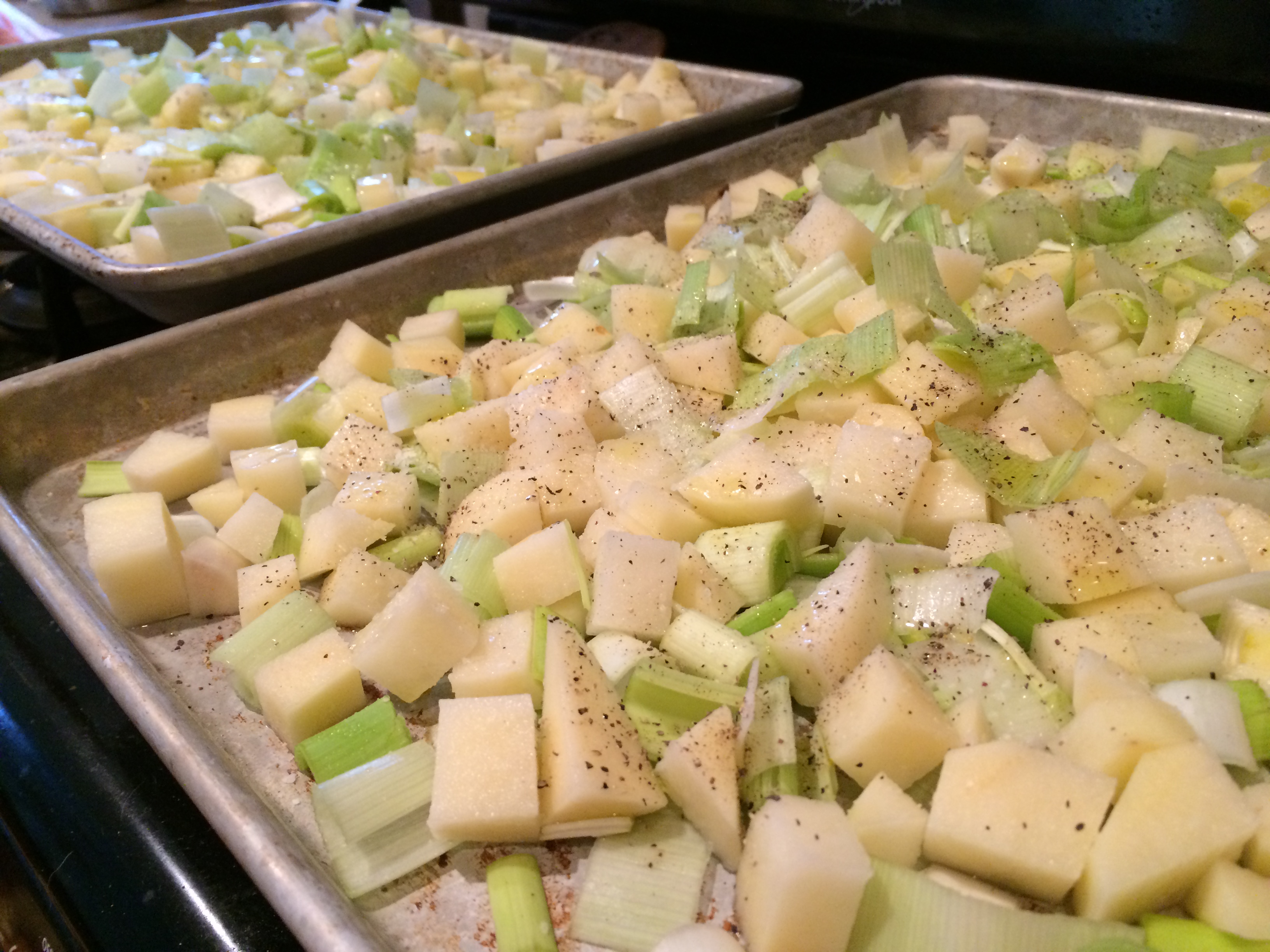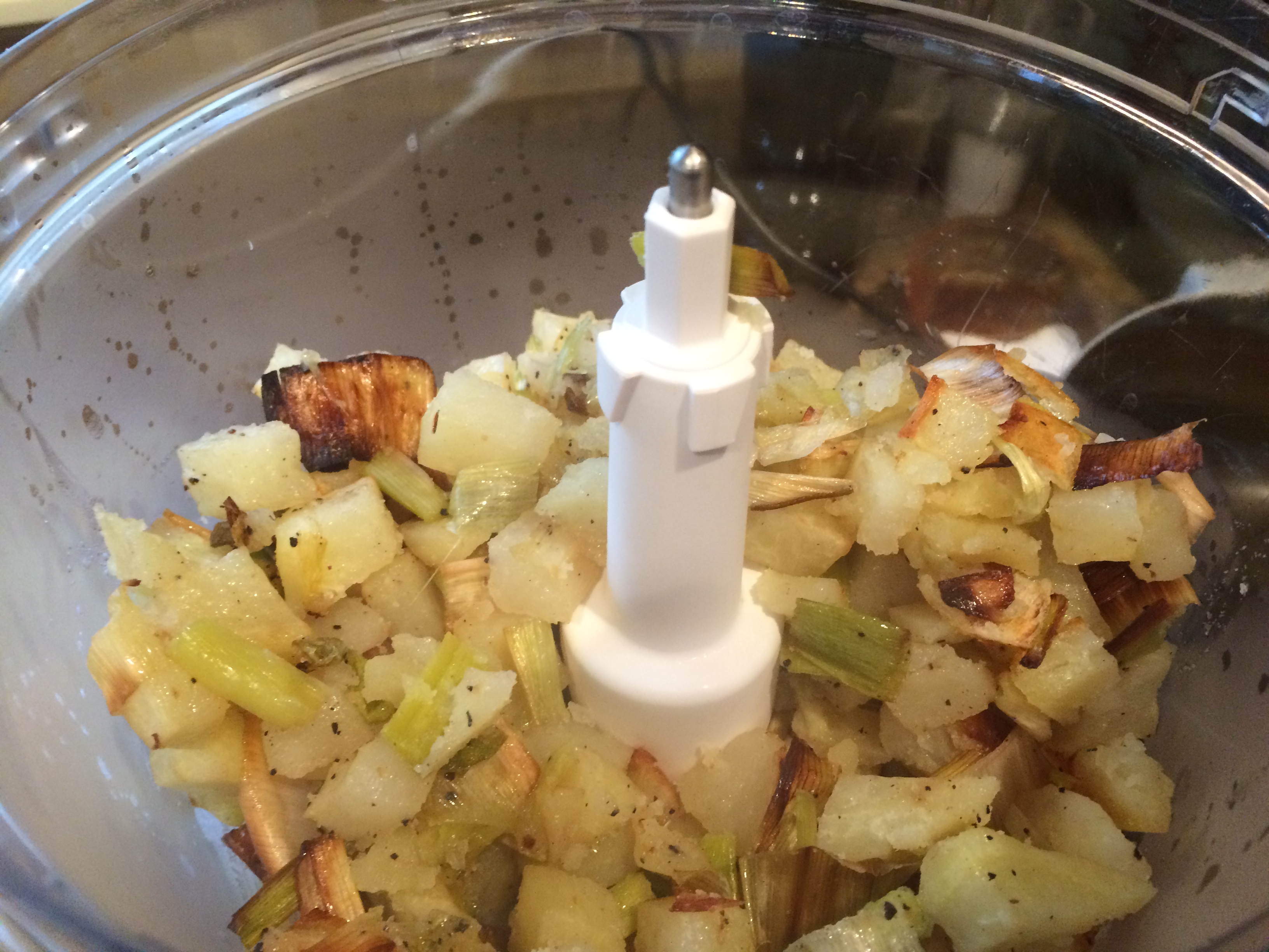 Tip: when processing the roasted vegetables in the food processor, don’t feel like you have to completely clean out the processor after each portion. Sometimes, the leeks have “strings” to them, like celery, that will get caught on the blade – leave them on the blade for a smoother soup!